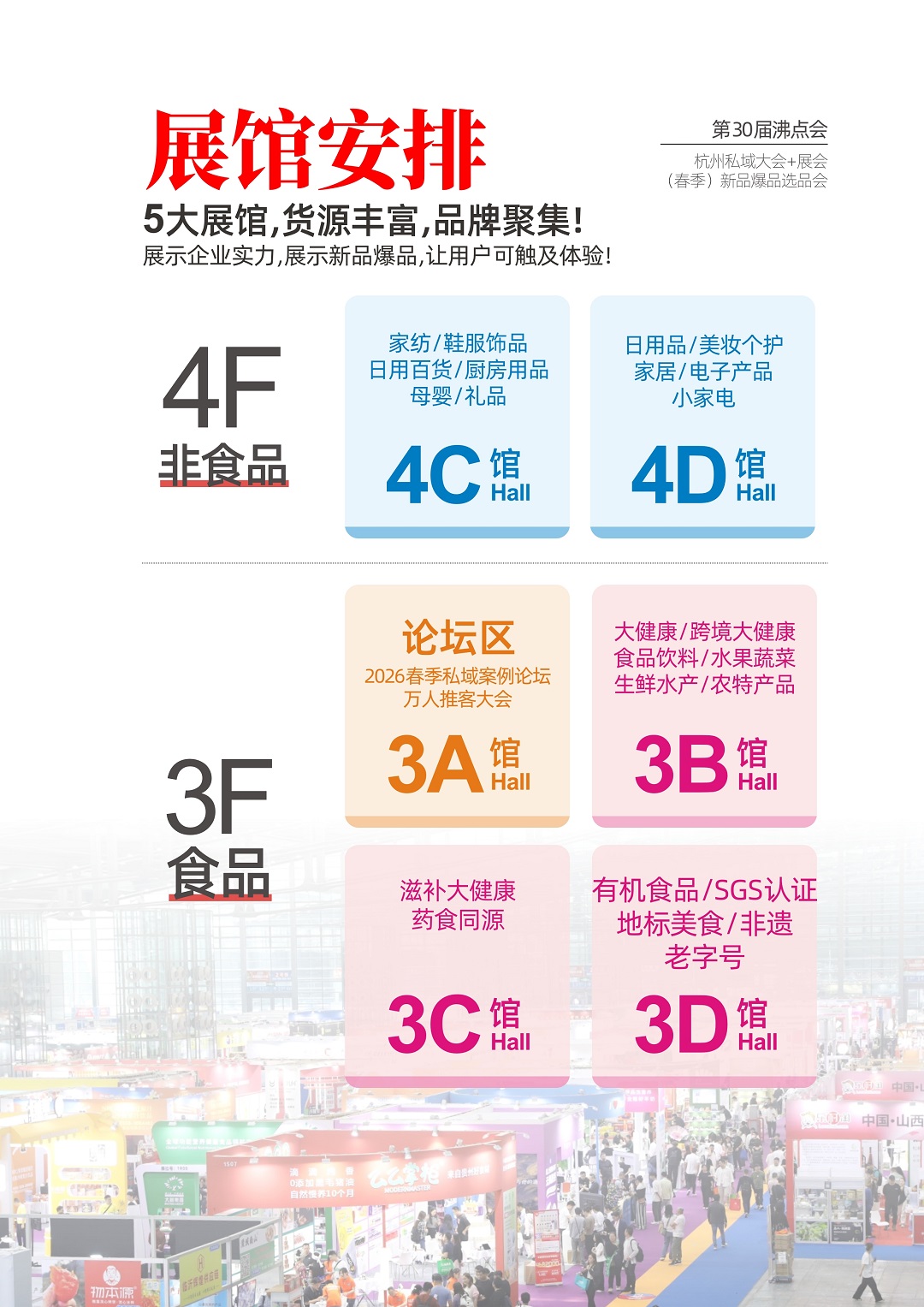 此次杭州沸點(diǎn)會(huì),將啟用杭州國(guó)際博覽中心6大展館:3A/3B/3C/3D/4C/4D,總面積超5萬(wàn)平米,1000+家優(yōu)質(zhì)參展商,10000+新品爆品展出,98%私域頭部渠道現(xiàn)場(chǎng)選品。