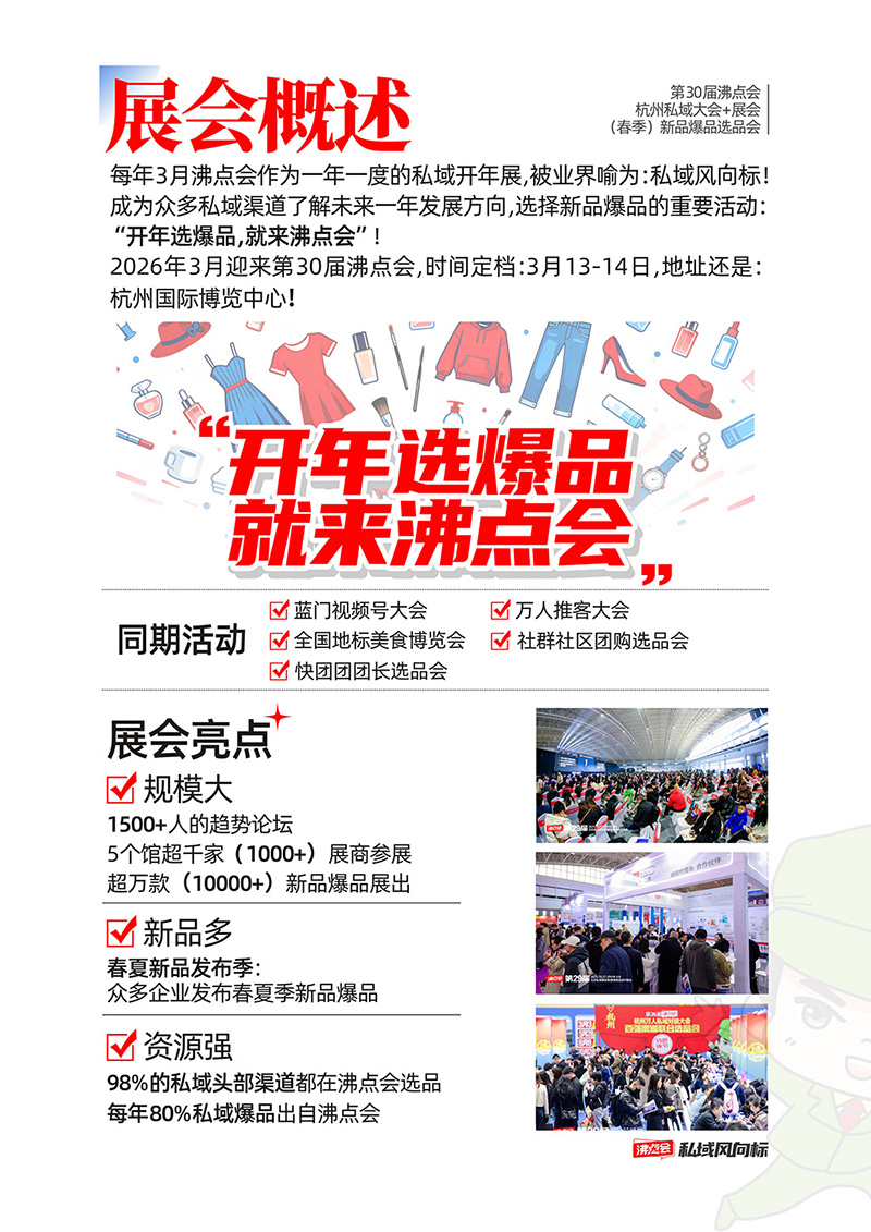 杭州萬人私域選品大會(簡稱沸點會)是由沸點會展(廣州)有限公司,每年固定3月13-14日在杭州國際博覽中心舉辦,是私域電商領(lǐng)域行業(yè)展會。截至2026年3月已連續(xù)舉辦30屆,且連續(xù)六年在杭州舉辦。